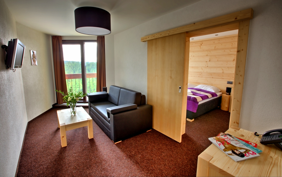 Suite „Mini“ Superior: kúpeľňa s WC a sprchovacím kútom, TV v každej izbe, trezor, minichladnička, francúzske okná a balkón, možnosť prístelky pre 1 dosp. osobu alebo 2 deti do 12 rokov.